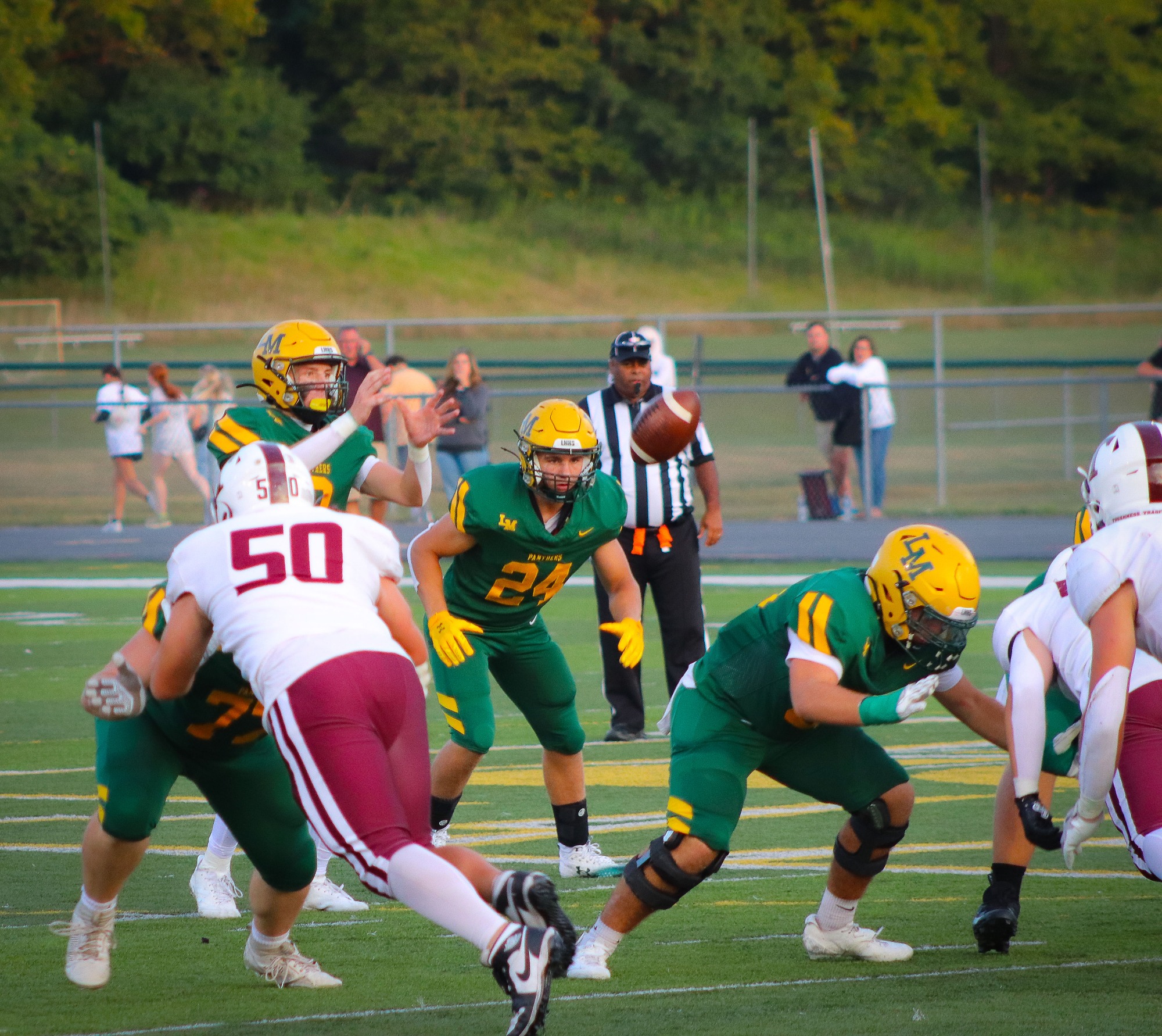 Little Miami, meanwhile, broke through after a pre-snap penalty backed them up to 1st-and-15 from their own 15. QB Camden Fox launched a deep ball to WR Lucas Basta for a 47-yard gain, their first major strike of the night. Thirteen plays later, Fox hit RB Andrew Trapp, who had leaked out into the flat and walked into the end zone on 3rd-and-10 from the Loveland 10. A penalty on the PAT moved the ball half the distance to the goal, prompting Coach Mahon to go for two. The try came up just short, and the Panthers trailed 7-6 at halftime.